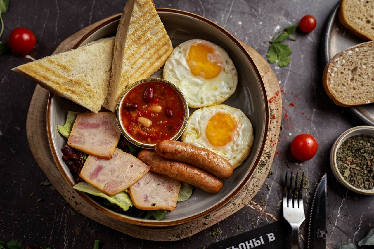 ▪️ На тарелке: Глазунья из двух яиц, сочные колбаски, хрустящий бекон, фасоль в томатном соусе, обжаренные грибы и поджаренные тосты.